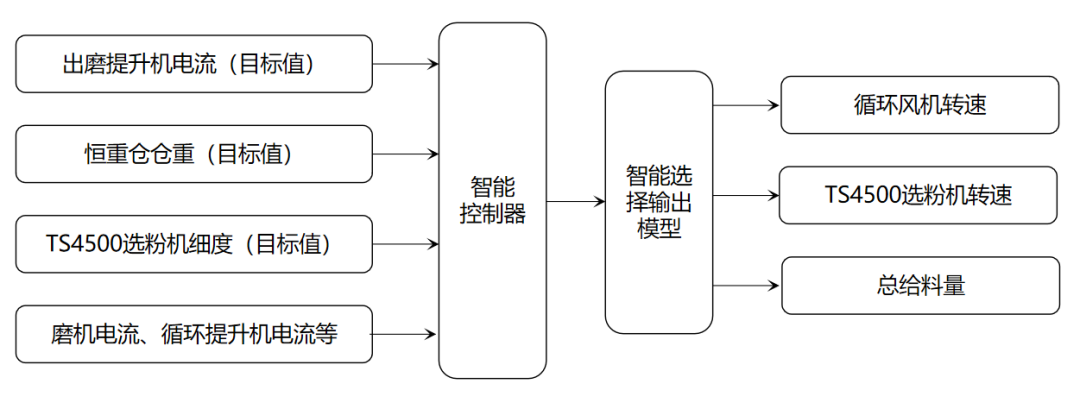 出磨提升机电流及稳流仓仓重的平稳控制是水泥磨平稳生产的核心,但这两个指标存在较多的共同影响因素,单一的设定值有可能导致在实现上述回路的常规控制后,形成内部持续波动,在此需要对两者进行协调。同时,稳流仓仓重控制的主要目的是使进入喂料仓的物料与进入辊压机的物料达到一个相对平衡的状态,以便辊压机能够工作在最佳状态并且不会对辊压机造成太大的冲击,既可以使辊压机运转稳、利用率提高,也可以延长其使用寿命。