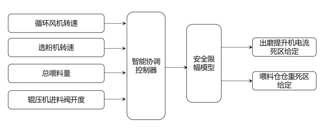 出磨提升机电流以及喂料仓仓重的平稳控制是水泥磨平稳生产的核心,但这两个指标存在较多的共同影响因素,单一的设定值有可能导致在实现常规控制后,形成内部持续波动。在此需要对两者进行协调,采用智能设定调节死区的方式来避免两个控制模型的干扰所导致的发散。