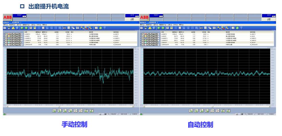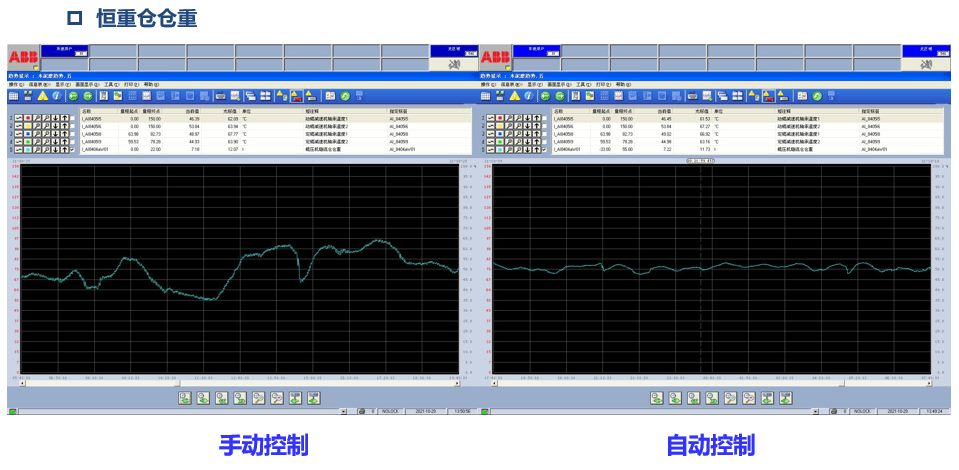 1、智能控制系统投运至今,实现自控率大于95%,辊压机循环系统和磨机系统始终保持平衡稳定状态,各参数波动幅度大幅度降低,水泥生产全智能、准无人化运行,可靠实现了生产过程的连续、平稳运行,下图为恒重仓仓位和出磨提升机电流手动控制和自动控制趋势对比图。