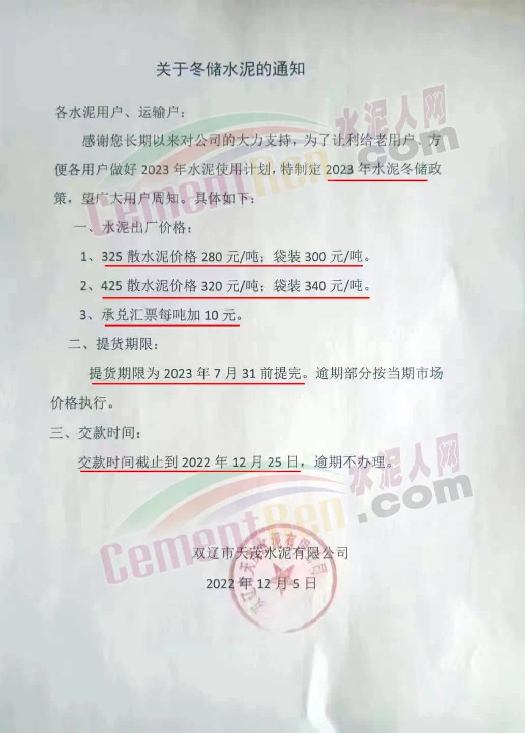 日前,吉林省双辽市天茂水泥发布《关于冬储水泥的通知》称,为感谢老客户对公司的大力支持,让利给老用户,方便各用户做好2023年水泥使用计划,特制定2023年水泥冬储政策。