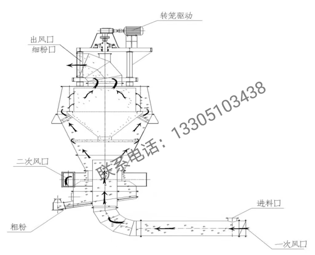 该选粉机突破了原有超细分级机生产能力小、选粉效率低,比表面积难于提高、微细粉宜团聚难于分散等多项技术瓶颈,解决了超细分级设备无法实现大规模分选超细微粉的关键技术难题。该选粉机分级精度准,选粉效率高,选粉效率平均值达到80.6%。在高选粉效率的情况下,保证适中的循环负荷(120%),以保证物料在超细球磨机内能够得到充分的研磨,可根据用户需要生产比表在700~1000m2/kg的超细微粉。