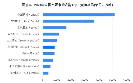 龙头企业方面,截至2021年底,中国(不含港澳台)前50家大企业集团的水泥熟料设计产能共计14.2亿吨,占全国总产能的77%。其中,前10家大企业集团的水泥熟料产能占全国总产能的58%,比2019年增长1%。