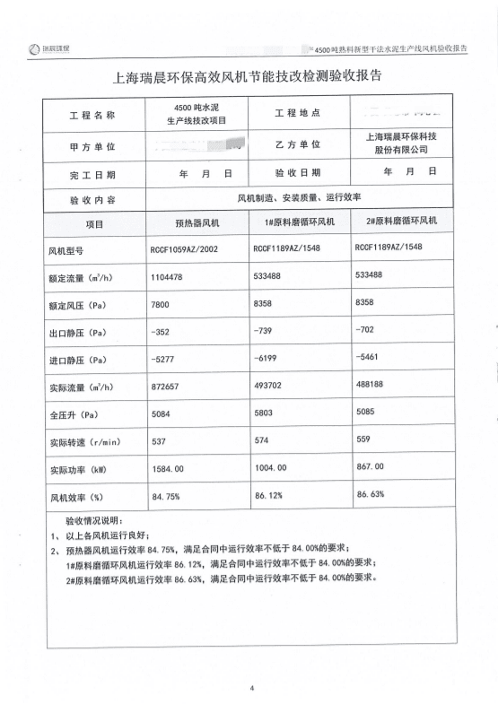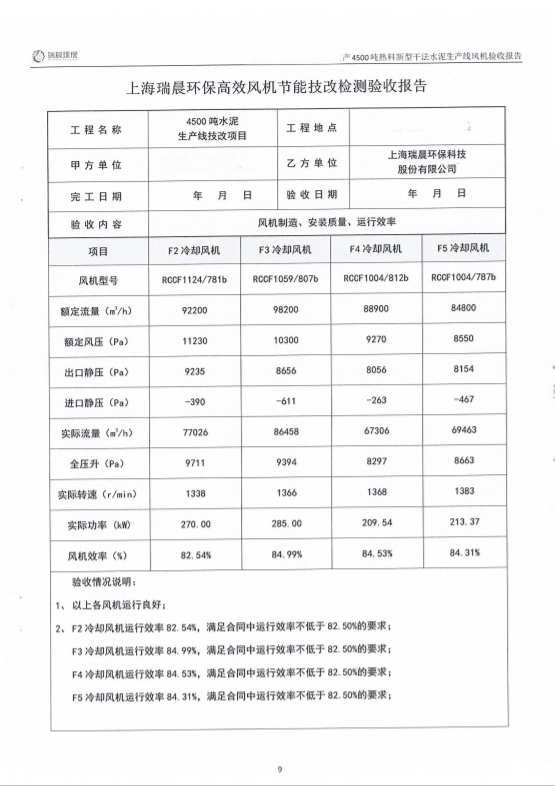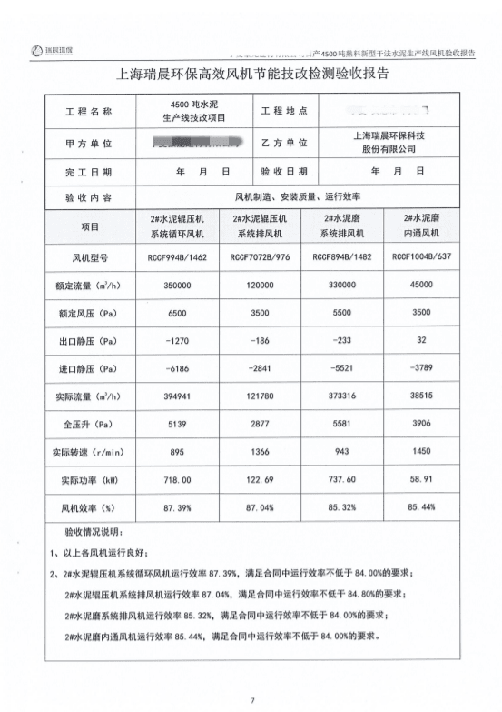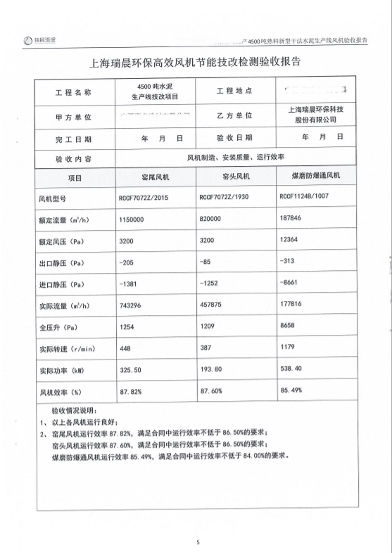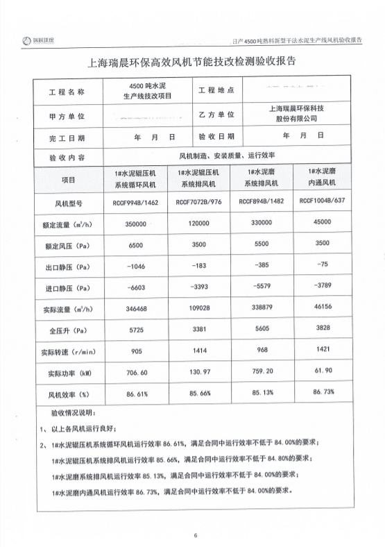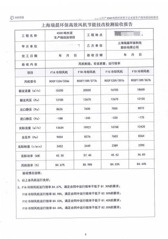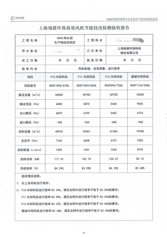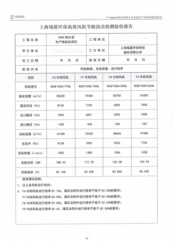 2022年8月,该水泥企业组织双方共同对全线风机进行了联合验收测试。测试结果显示,风机运行良好,实测效率优于合同约定效率,达到双方约定的验收指标,风机单耗低,使用效果好。