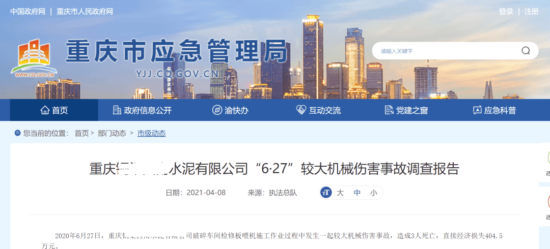 2020年6月27日,重庆铜梁某水泥有限公司破碎车间检修板喂机施工作业过程中发生一起较大机械伤害事故,造成3人死亡,直接经济损失404.5万元。