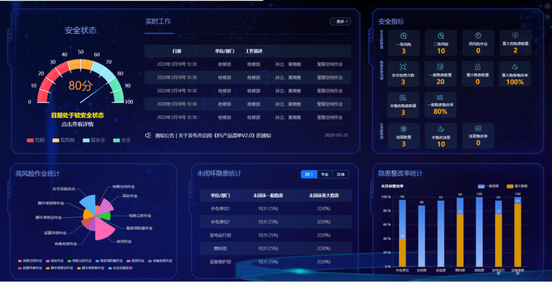 依据安全生产各项工作统计数据,以安全数据专业化分析和建模为基础,自动生成安全生产各项工作开展情况统计图表分析和整体安全生产状态及预警趋势图表分析,量化展示水泥企业安全状态,实时展示工作动态,相关负责人可根据数据分析快速处置可能发生的动态风险。