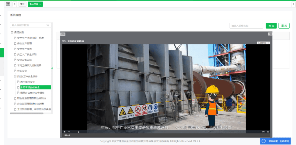 系统内置安全教育培训功能模块和丰富的安全教育培训课件,可在线实现人员考勤、培训、考试、建档等功能,实现水泥企业安全培训信息化监管,便于管理人员掌握安全管理现状并及时查缺补漏,提升员工专业能力和安全文化素质水平,从而推进企业整体安全管理水平稳步上升。