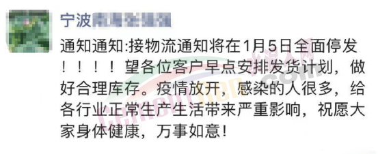 宁波一企业通知称:接物流通知将在1月5日全面停发。望各位客户早点安排发货计划,做好合理库存。疫情放开,感染的人很多,给各行业正常生产、生活带来严重影响。