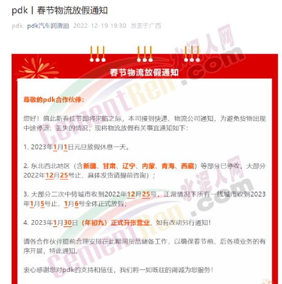 pdk汽车润滑油春节物流放假通知称,公司接到快递、物流公司通知,为避免货物出现中途停运、丢失的情况,2023年1月1日元旦放假休息一天。