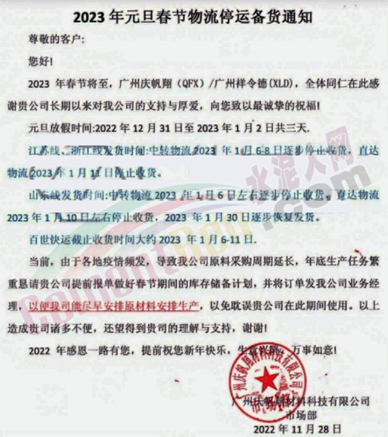 广州庆帆翔材料科技有限公司通知,江苏、浙江发货时间中转物流2023年1月6~8日逐步停止发货,直到物流2023年1月11日停止收货;山东发货时间,中转物流2023年1月6日左右逐步停止发货,直达物流2023年1月10日左右停止收货,2023年1月30日逐步恢复发货。百世快运截止收货时间大约2023年1月6-11日。