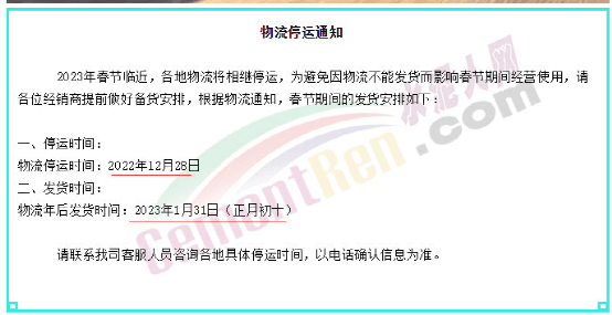 美丰机械通知,2023年春节临近,各地物流将相继停运,为避免因物流不能发货而影响春节期间经营使用,请各位经销商提前做好备货安排,根据物流通知,物流停运时间为2022年12月28日。物流年后发货时间为2023年1月31日(正月初十)。