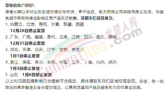 据水泥人网了解,目前已有多家物流公司发布春节停运的通知。受大多物流公司停运影响,各行各业产业链的运行均受到一定的影响,相继出现发货困难、配套供应紧缺及生产任务加重的问题。