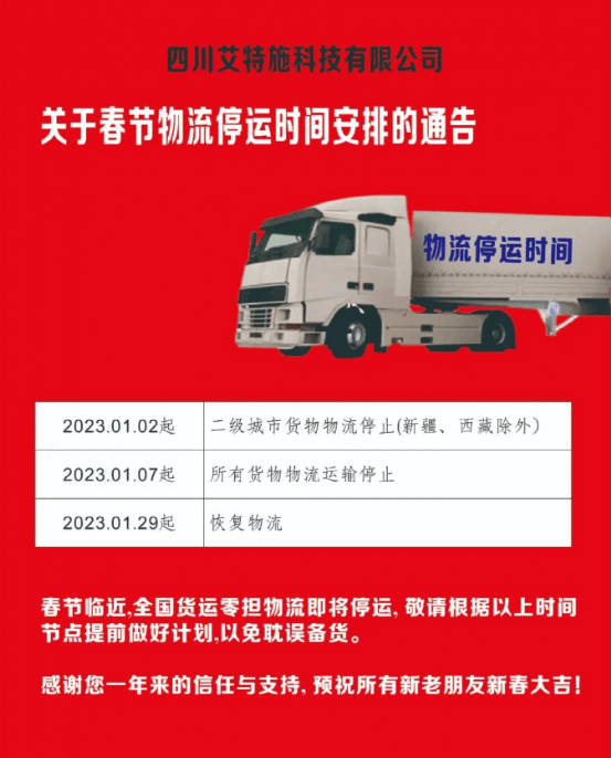 四川艾特施科技通知,2023年1月2日起二级城市货物物流停止(新疆、西藏除外)。2023年1月7日起所有货物物流运输停止。2023年1月29日起,恢复物流。