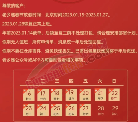 “老乡递”春节放假时间为2023年1月15日至1月27日,1月28日恢复正常上班。年前2023年1月14日截单,后续至复工前不处理打包。假期无人值班,所有申请单,消息统一年后处理回复。同时提示,假期不要往仓库寄件,避免快递丢失。已寄出包裹快递员将于年后派送。
