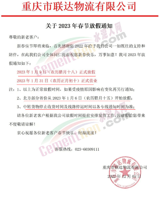 重庆市联达物流有限公司2023年1月9日(农历腊月十八)正式放假,2023年1月31日(农历正月初十)正式营业。如果受疫情原因影响有变化再另行通知;北方部分省份从2023年1月6日(农历腊月十五)开始放假;中转货物停止收货时间及线路停运时间以各专线通知时间为准。