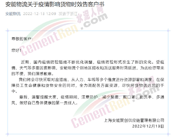上海安能聚创供应链管理有限公司通知称,近期,国内疫情防控措施不断优化调整,疫情防控形势发生了新的变化。受疫情、天气等多重因素影响,安能物流个别地区揽收和派送服务时效延迟。