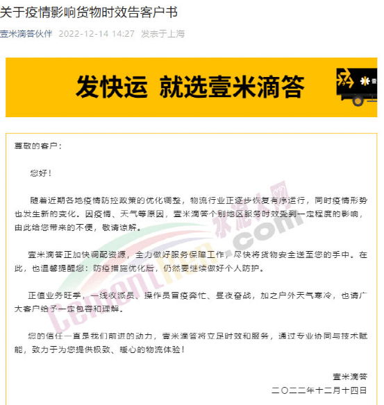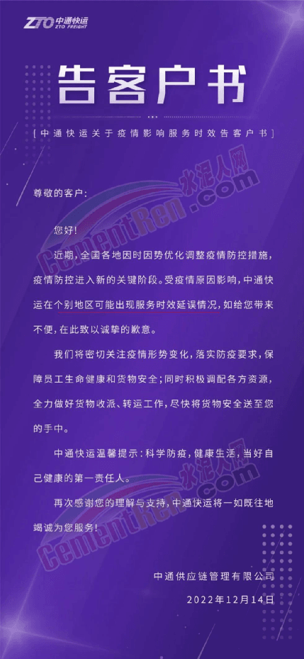 中通快运关于疫情影响服务时效告客户书称:近期,全国各地因时因势优化调整疫情防控措施,疫情防控进入新的关键阶段。受疫情原因影响,中通快运在个别地区可能出现服务时效延误情况,如给您带来不便,在此致以诚挚的歉意。将密切关注疫情形势变化,落实防疫要求,保障员工生命健康和货物安全;同时积极调配各方资源,全力做好货物收派、转运工作,尽快将货物安全送至您的手中。