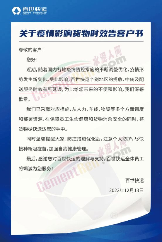 百世快运通知,近期,随着国内各地疫情防控措施的不断调整优化,疫情形势发生新变化。受此影响,百世快运个别地区的揽收、中转及配送服务时效有所延误,为此给您带来的不便和影响,我们深感歉意。