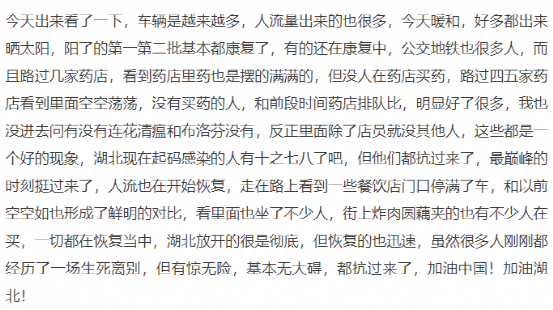 有网友在媒体平台发消息称,阳的第一第二批基本康复了,有的还在康复中,公交地铁有很多人,路过几家药店,看到除了店员没有其他人,餐饮店门口停满了车,街上炸肉圆藕夹的也有不少人在买,一切都在恢复当中。