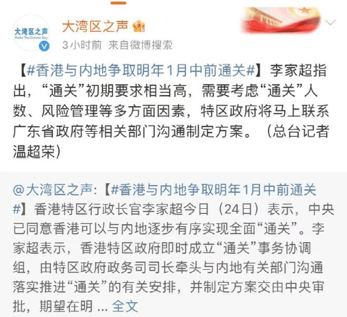 香港特区行政长官李家超于2022年12月24日表示,中央已同意香港可以与内地逐步有序实现全面“通关”。李家超表示,香港特区政府即时成立“通关”事务协调组,由特区政府政务司司长牵头与内地有关部门沟通落实推进“通关”的有关安排,并制定方案交由中央审批,期望在2023年1月中之前逐步有序落实。