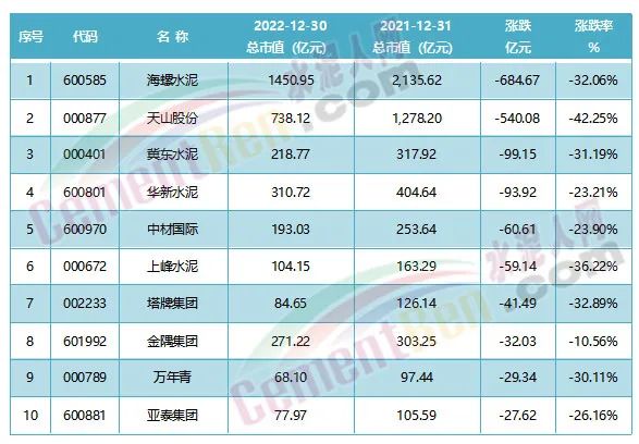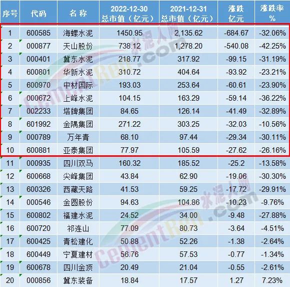 从水泥行业A股20家主流上市公司来看,市值蒸发达一千多亿。