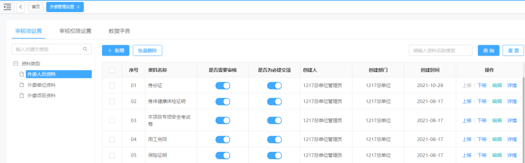 2.水泥企业管理人员可在平台进行相关方管理,设置相关方项目、单位及人员分别需提交的资料及审核内容作为准入条件,相关方单位资质及人员审核通过才能被录入平台,审核不通过则系统自动研判为不具备准入条件,相关方单位及人员则无法入厂。