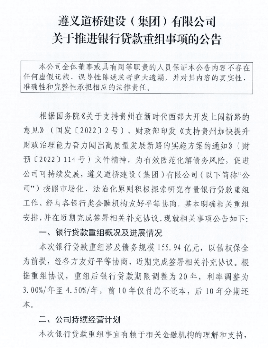 近日,贵州遵义最大城投——遵义道桥建设(集团)有限公司(下称“遵义道桥”)披露的银行贷款重组方案引起广泛关注。根据重组协议,155.94亿元银行贷款重组后期限调整为20年,利率调整为3%/年~4.5%/年,前10年仅付息不还本,后10年分期还本。近156亿元银行债务展期至20年实属罕见。