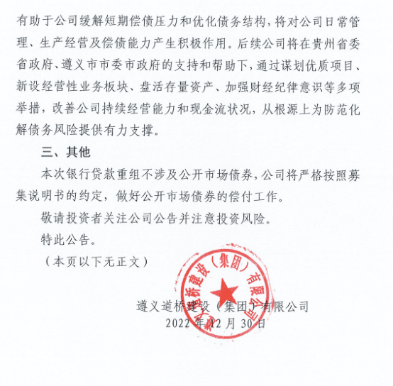 消息一出,震惊了金融圈,“它明明可以不还钱,却选择拖20年,可谓是优雅的做老赖了”。尽管此次遵义道桥成功对约156亿元银行债务进行了重组,但截至2022年6月末,遵义道桥的有息负债余额为457.54亿元,除去此次重组的155.94亿元银行贷款外,遵义道桥还存在大量信托等非标债务,这部分非标债务如何化解也备受关注。