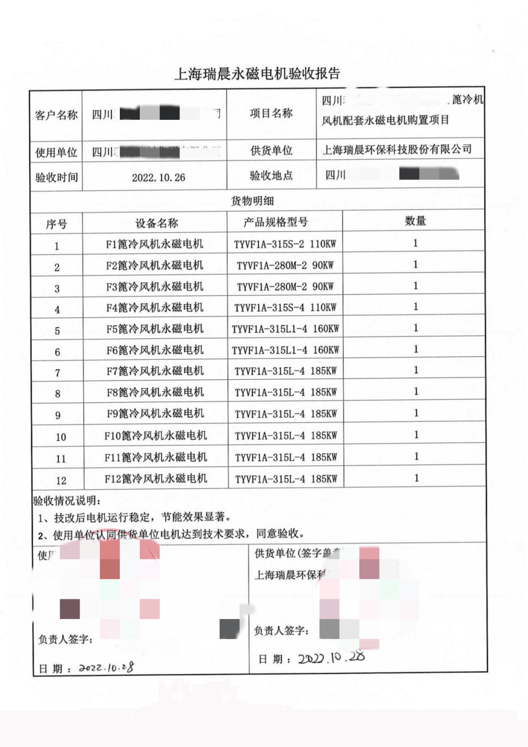 在篦冷风机和永磁电机正常运行后,该水泥企业联合瑞晨环保和第三方对其进行验收,验收报告如下所示: