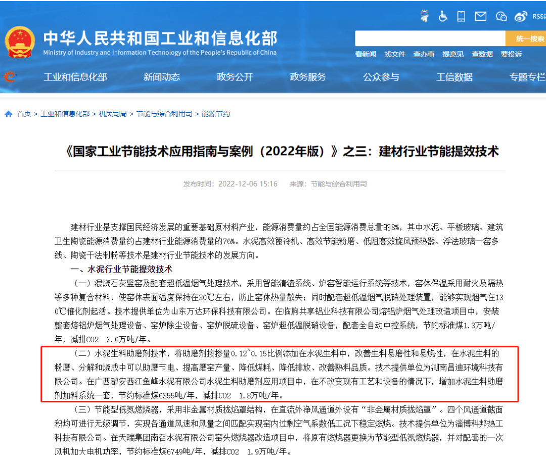为加快推广应用先进适用节能技术装备,促进企业节能降碳、降本增效,工信部近日发布了《国家工业和信息化领域节能技术装备推荐目录(2022年版)》,湖南昌迪环境科技有限公司(以下简称“湖南昌迪”)申报的水泥生料助磨剂应用技术纳入建材行业节能提效技术装备推荐。
