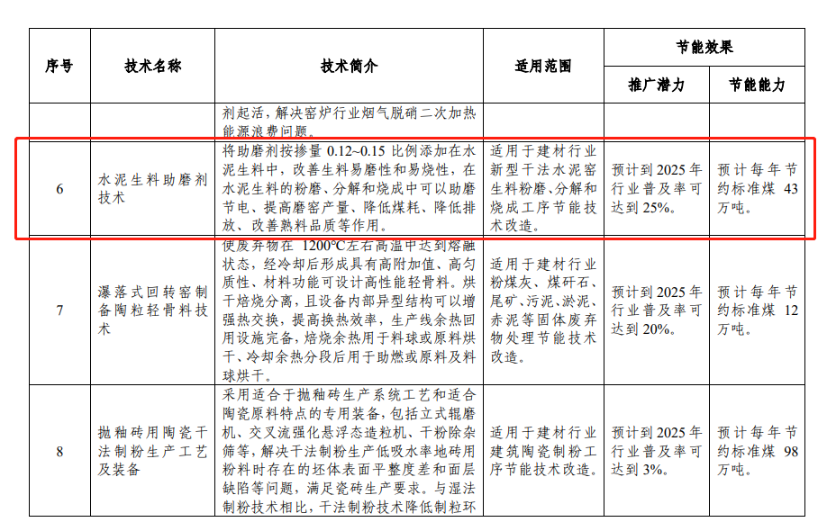湖南昌迪此次申报的水泥生料助磨剂技术原理是改善生料易磨性和易烧性,在水泥生料粉磨、分解和烧成中可以助磨节电、提高磨窑质量、降低排放、改善熟料品质等作用。该技术适用于建材行业新型干法水泥窑生料粉磨、分解和烧成工序的节能技术改造。节能效果预计到2025年行业普及率可达25%,每年节约标准煤43万吨。
