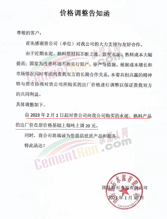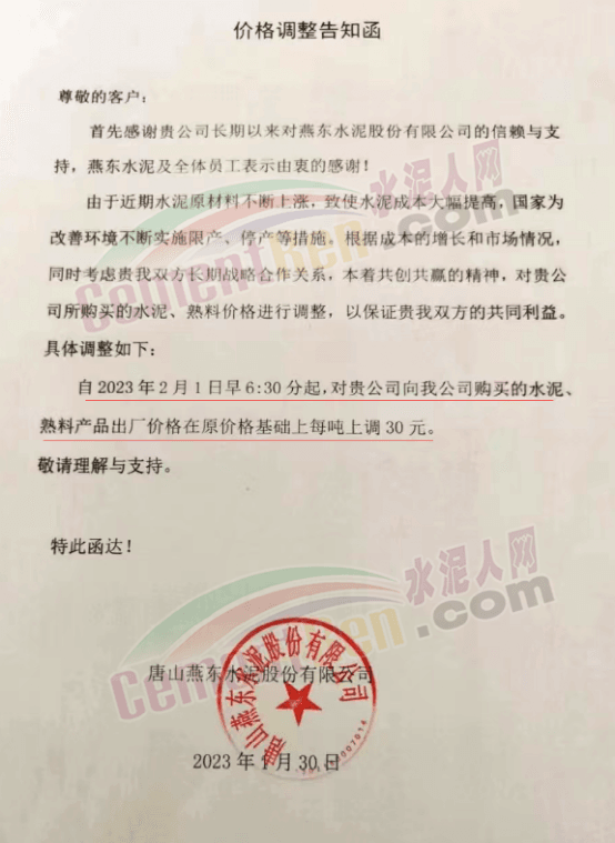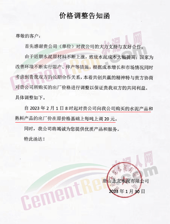 日前,唐山圣龙水泥有限公司、唐山燕东水泥股份有限公司、滦县磐石水泥有限公司等水泥企业发布价格调整告知函称,由于近期水泥、熟料原材料不断上涨,致使水泥、熟料成本大幅提高;国家为改善环境不断实行限产、停产等措施。根据成本增长和市场情况自2023年2月1日起对水泥、熟料产品的出厂价格上调20元/吨。