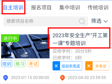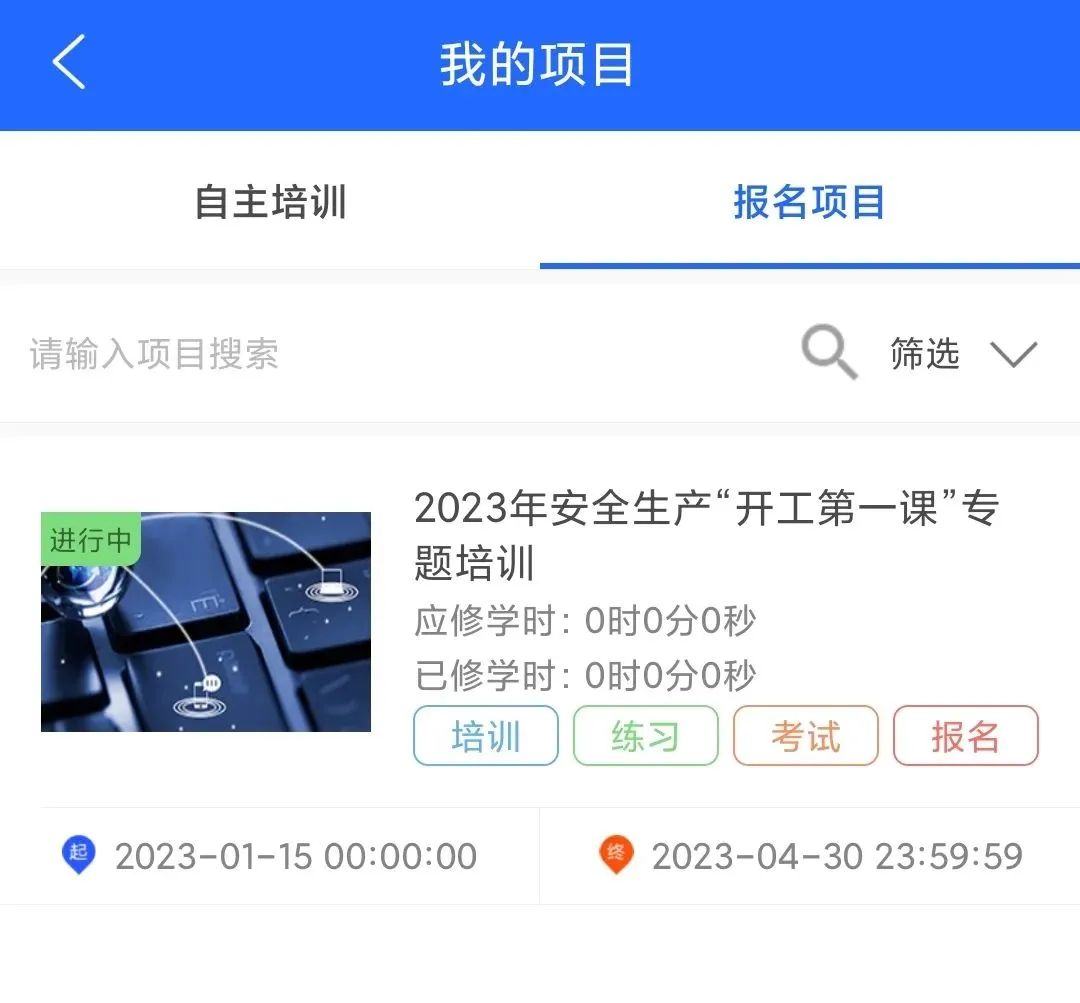 学员登录APP,在【培训】-【我的项目】-【报名项目】报名2023年安全生产“开工第一课”专题培训项目,报名后进入【自主培训】标签点击项目开始学习。