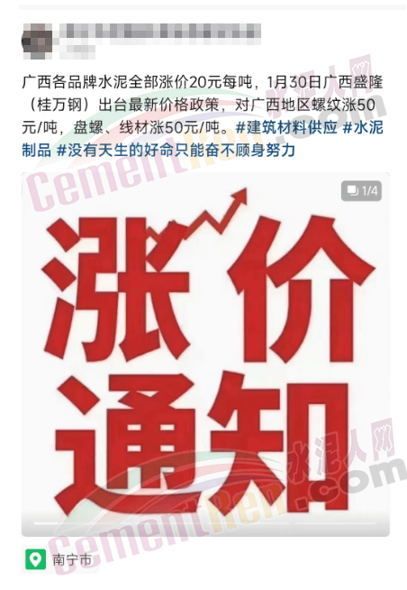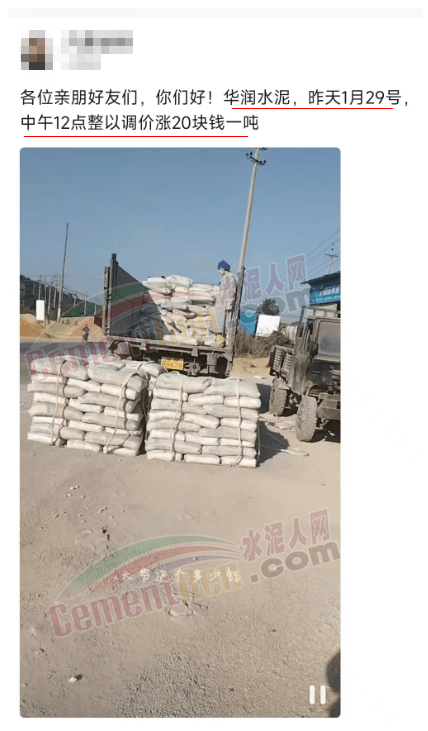 另一华润水泥经销商发消息确认:“华润水泥1月29日中午12点整已调价20元/吨。”