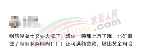 另一经销商发视频称“钢筋混凝土又要大涨了,随便一吨都上万了。比矿值钱了,还可满额贷款,堪比黄金啊!”