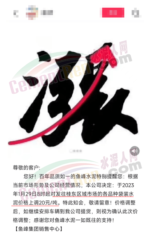 鱼峰集团经销商转发企业销售中心对发往桂东区域市场的各品种袋装水泥价格上调20元/吨的通知。
