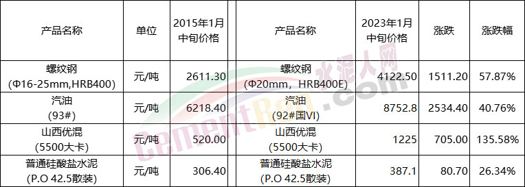 价格方面,国家统计局1月24日公布了2023年1月中旬流通领域重要生产资料市场价格变动情况。对比2015年相关数据可见,煤炭价格上涨了135.58%,螺纹钢及汽油分别上涨了57.87%和40.76%,而P.O42.5散装水泥价格仅上涨了26.34%。