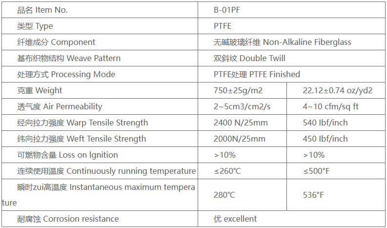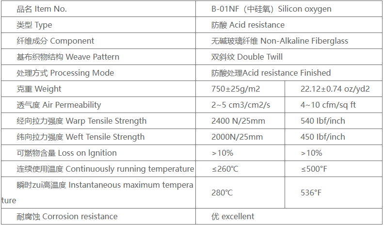 B-01NF玻纤滤料具有优良的耐热性,可在260°以下长期使用;机械强度高、伸缩率小。断裂强度一般在1300N以上,使用其制作的滤袋具有足够的抗拉强度和尺寸稳定性;同时具有优良的耐腐蚀性能,在酸、碱气体中均可以使用;表面光滑、透气性好、过滤阻力小,有利于粉尘剥离。