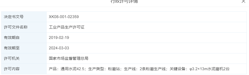 其工业品生产许可证(XK08-001-02359)信息显示,企业为拥有两条粉磨生产线的粉磨站,关键设备为φ3.2×13m水泥磨机两台。