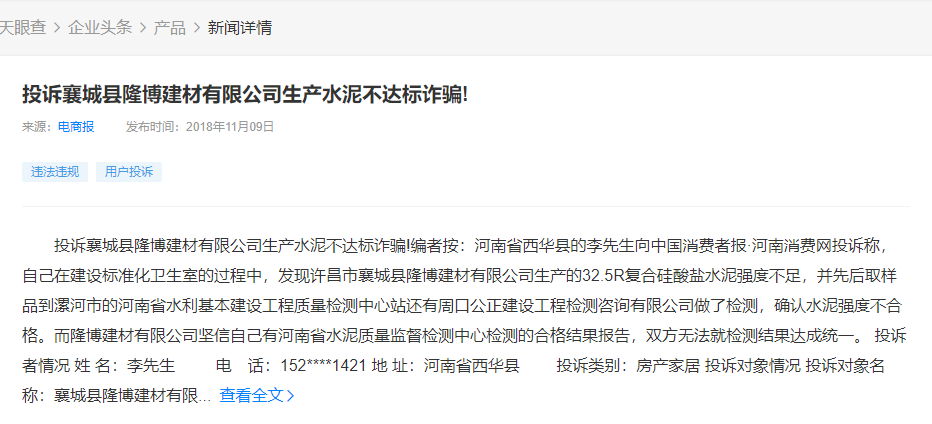 新闻舆情显示,企业在2018年曾因生产水泥不达标被投诉。