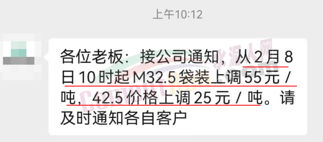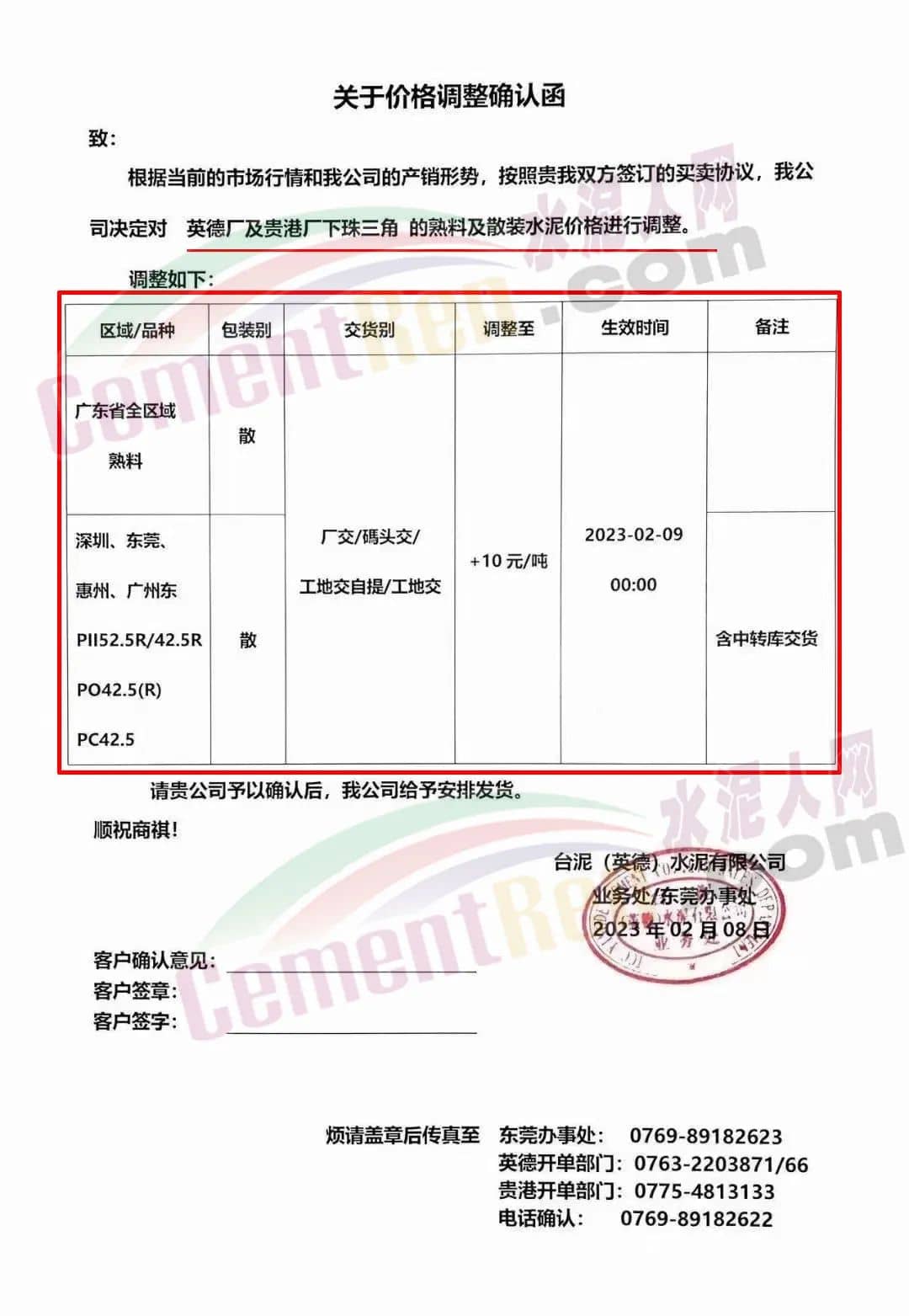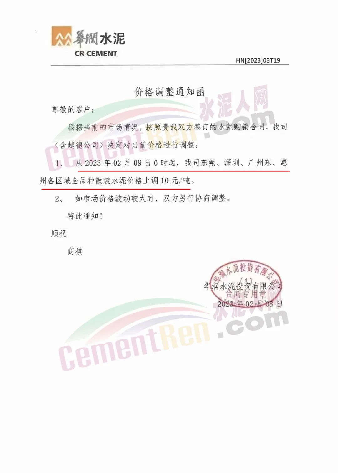 华润水泥通知称,根据当前的市场情况,从2月9日0时起,公司东莞、深圳、广州东、惠州各区域全品种散装水泥价格上调10元/吨。