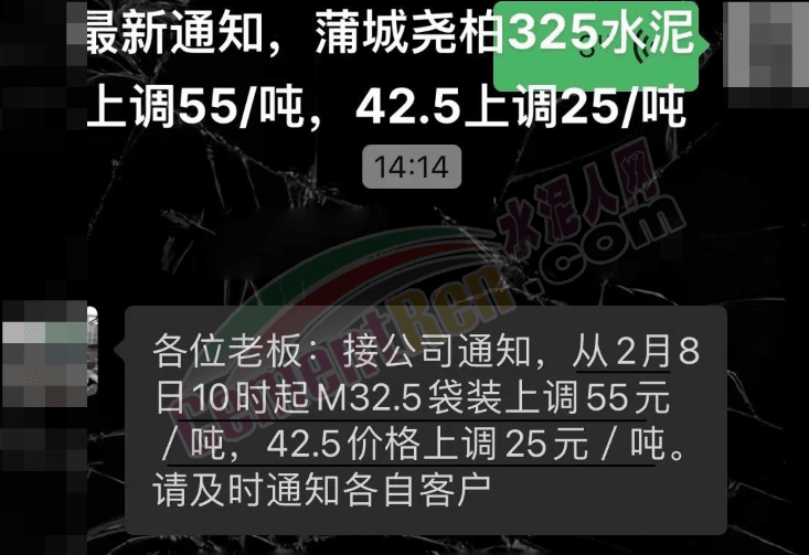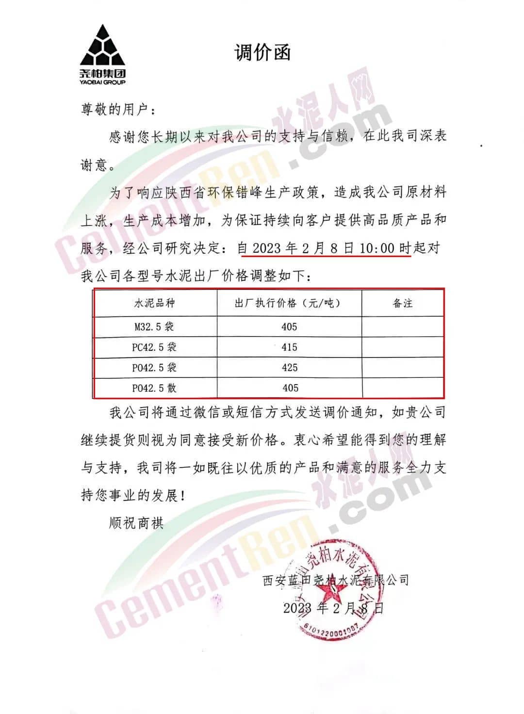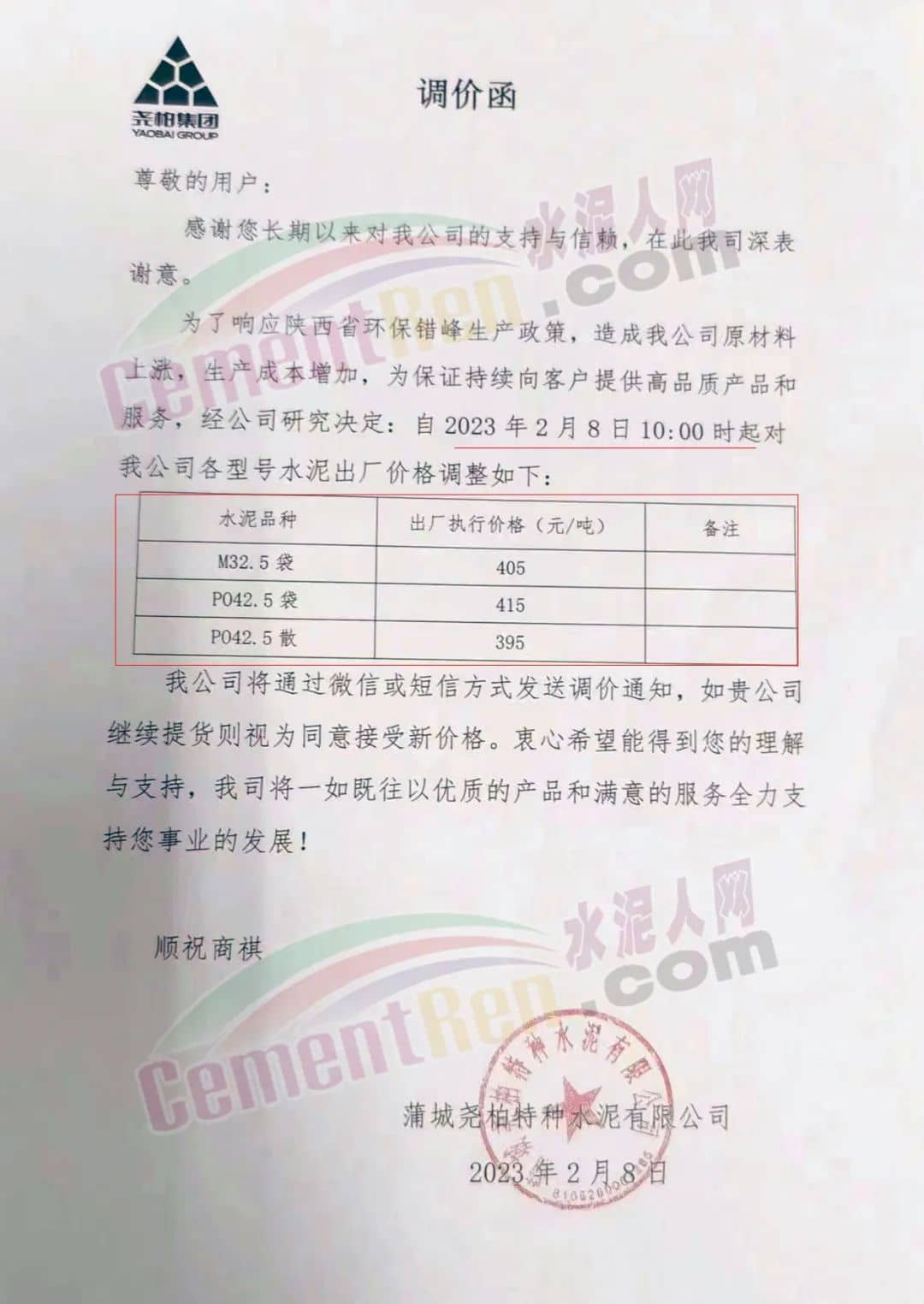 企业调价通知中提到,为响应陕西省环保错峰生产政策,造成公司原材料上涨,生产成本增加,为保证持续向客户提供高品质产品和服务经公司研究决定自2月8日10时起对公司各型号水泥出厂价格进行调整。调价后,如客户继续提货则视为同意价格。