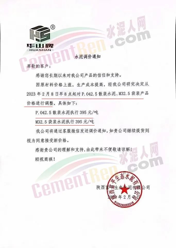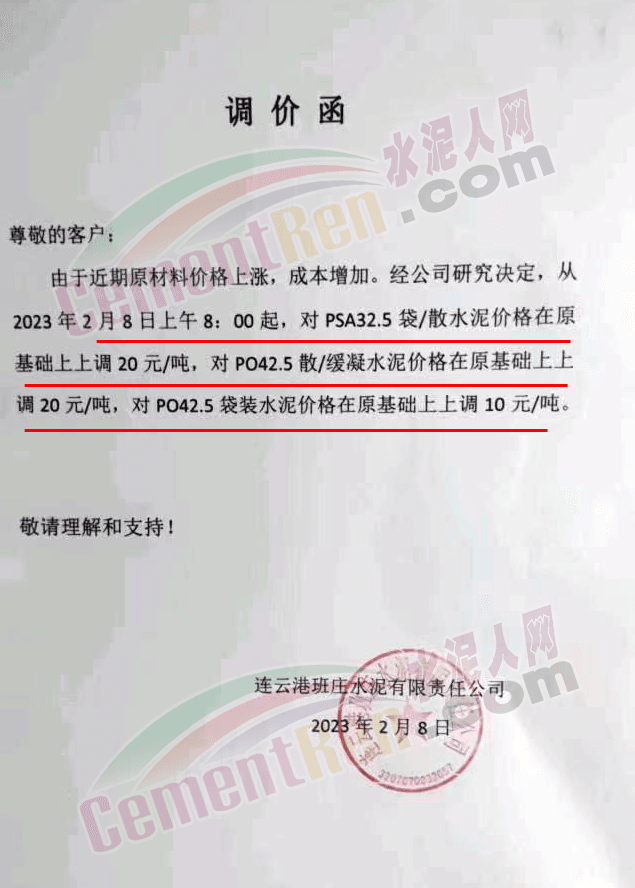 连云港班庄水泥有限责任公司通知称,由于近期原材料价格上涨,成本增加。经公司研究决定,从2023年2月8日上午8:00起,对PSA325袋/散水泥价格在原基础上上调20元/吨,对PO42.5散/缓凝水泥价格在原基础上上调20元/吨,对PO42.5袋装水泥价格在原基础上上调10元/吨。