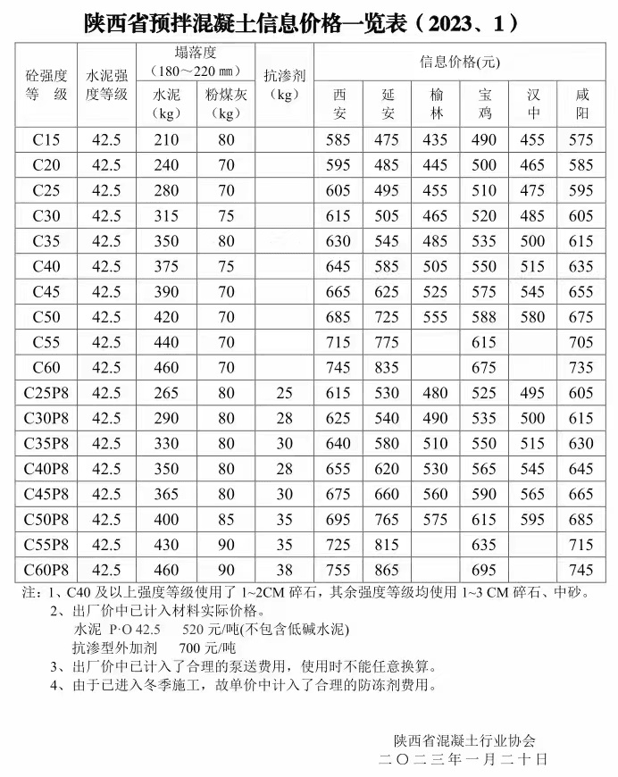 从陕西省混凝土行业协会近期发布的2023年1月预拌混凝土信息价格一览表中可见,西安、延安、榆林、宝鸡 、汉中、咸阳5个地区C30混凝土报价与2022年12月份持平。预拌混凝土材料实际价格中P.O42.5按520元/吨计算。上述主要品牌企业P.O42.5散装水泥出厂价格上调后仍不足400元/吨,与信息价备注中的520元/吨仍相差125元/吨。