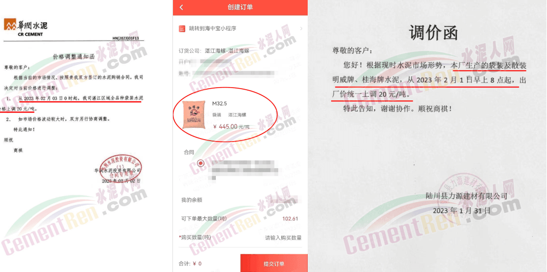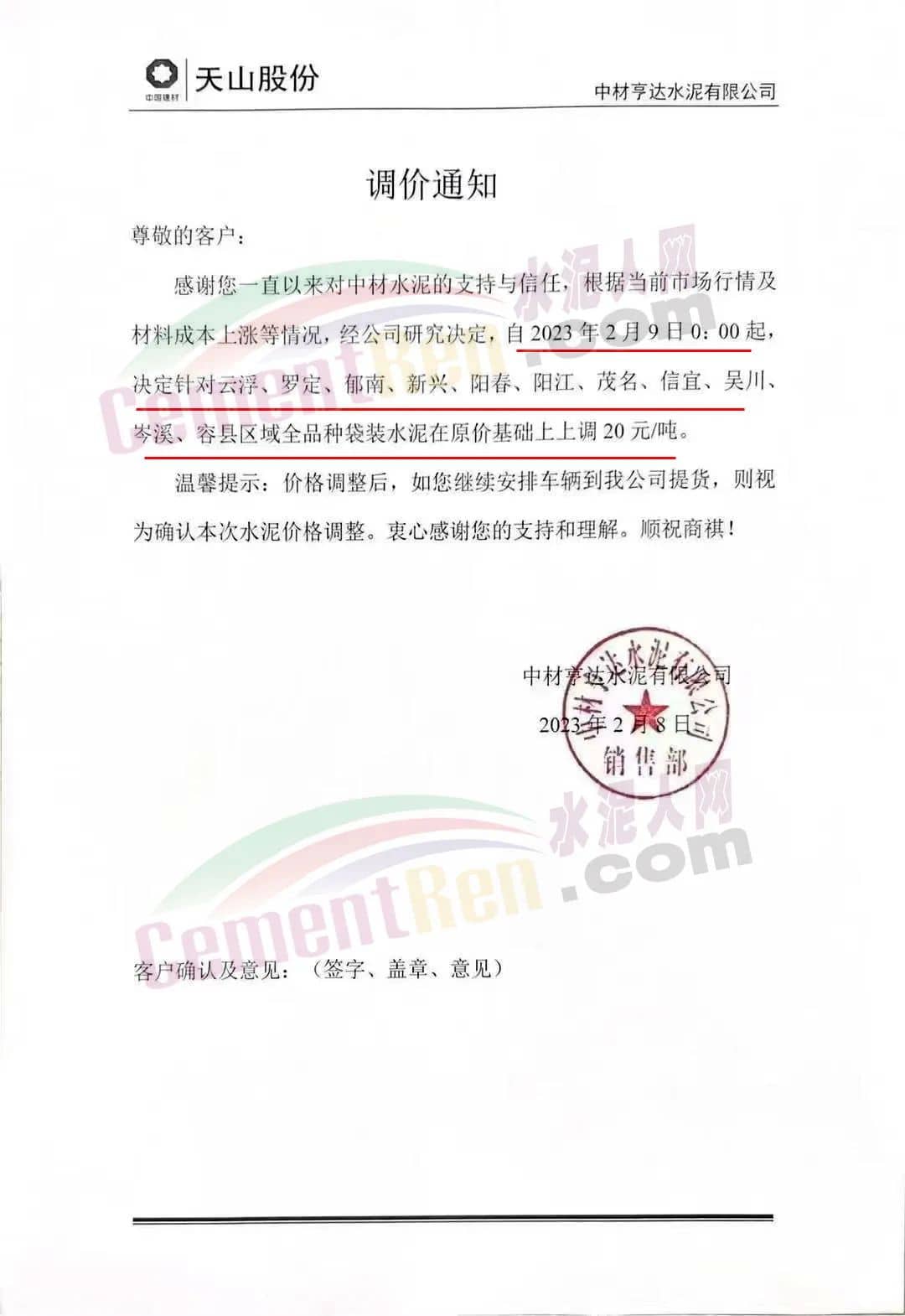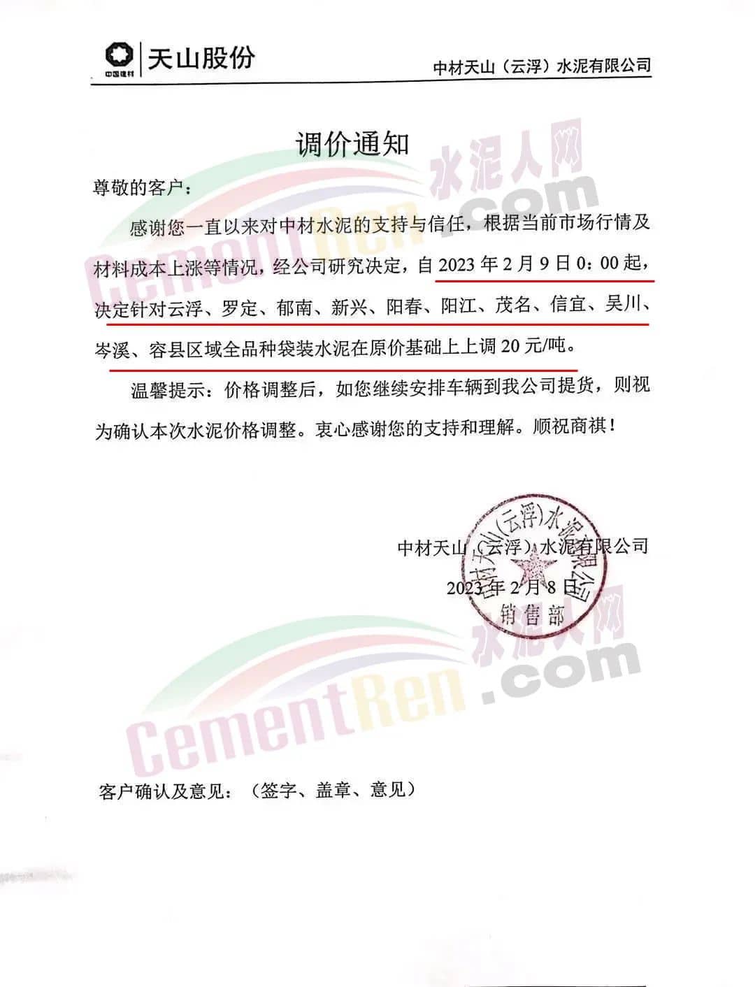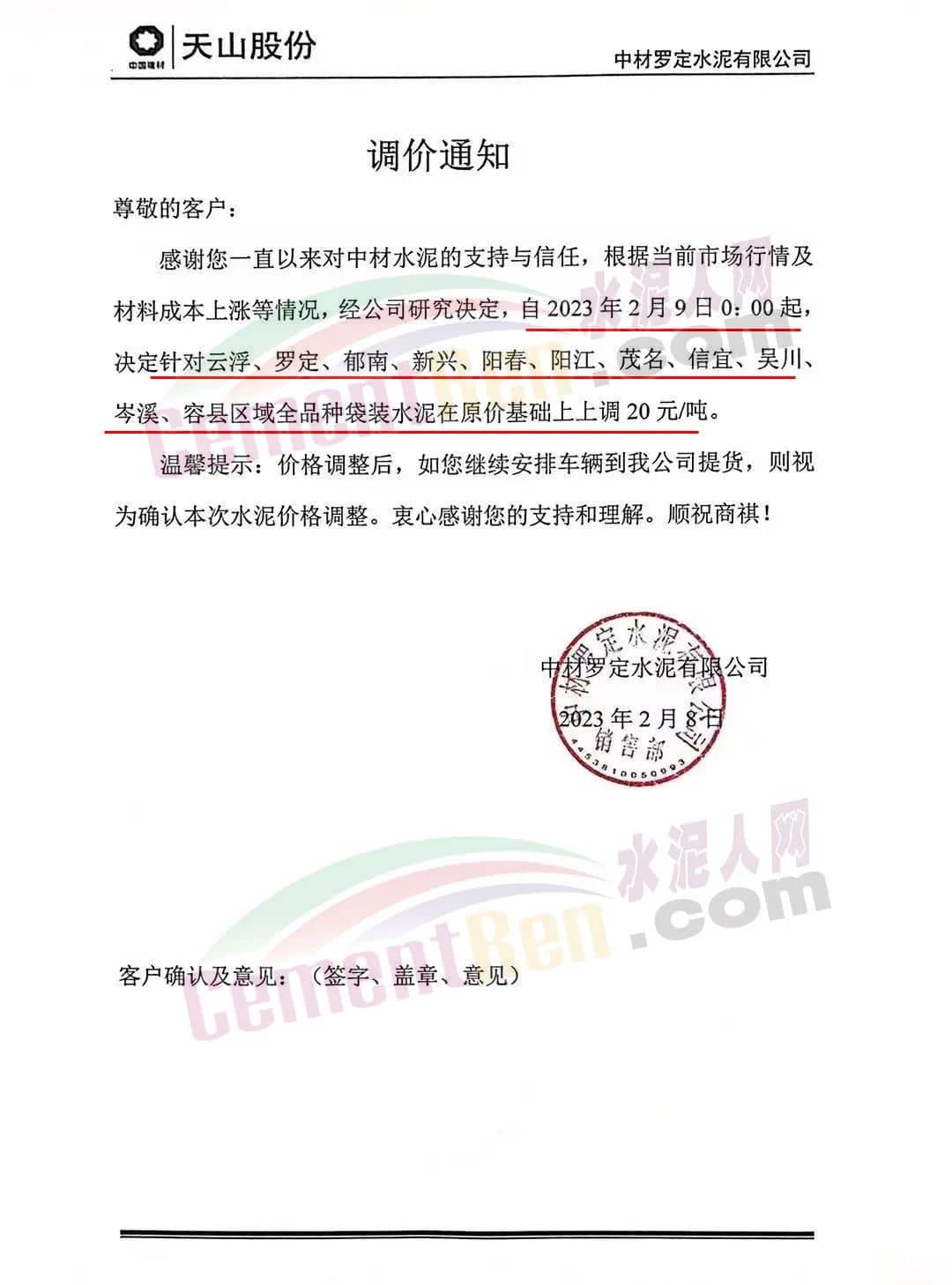 中材天山(云浮)水泥有限公司、中材亨达水泥有限公司、中材罗定水泥有限公司调价通知称,根据当前市场行情及材料成本上涨等情况,经公司研究决定,自2023年2月9日0时起决定针对云浮、罗定、郁南、新兴、阳春、阳江、茂名、信宜、吴川、岑溪、容县区域全品种袋装水泥在原价基础上上调20元/吨。