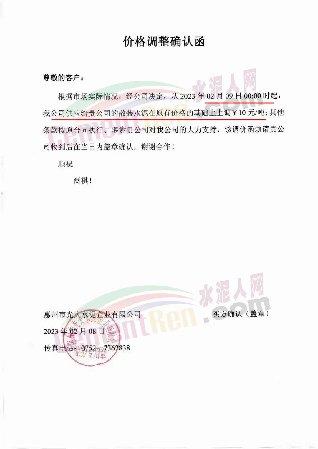 惠州光大水泥企业有限公司通知称,根据市场实际情况,公司决定从2月9日0时起,散装水泥在原有价格的基础上上调10元/吨。
