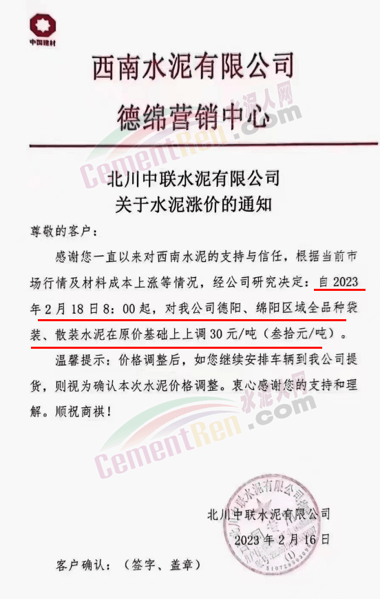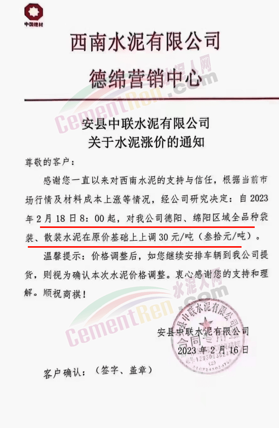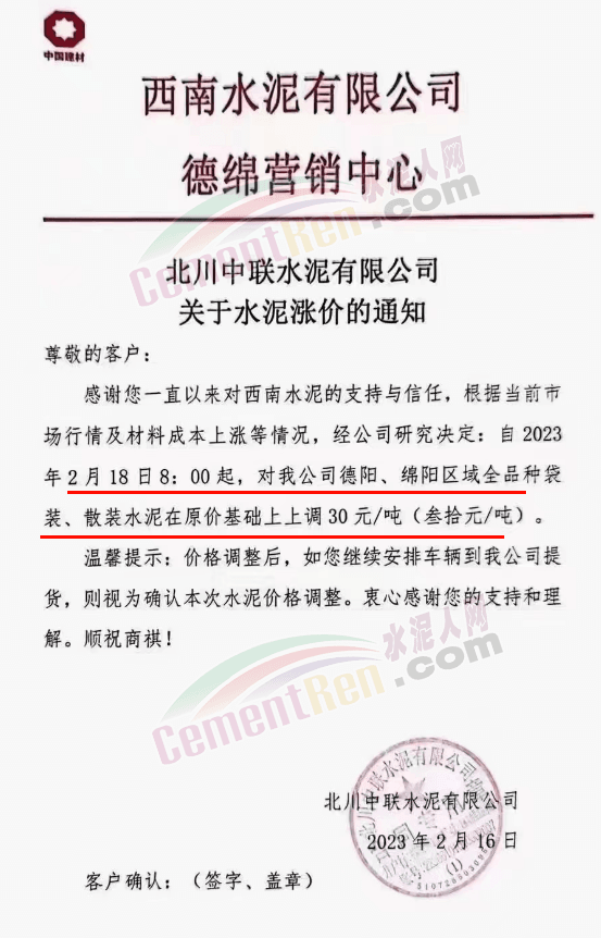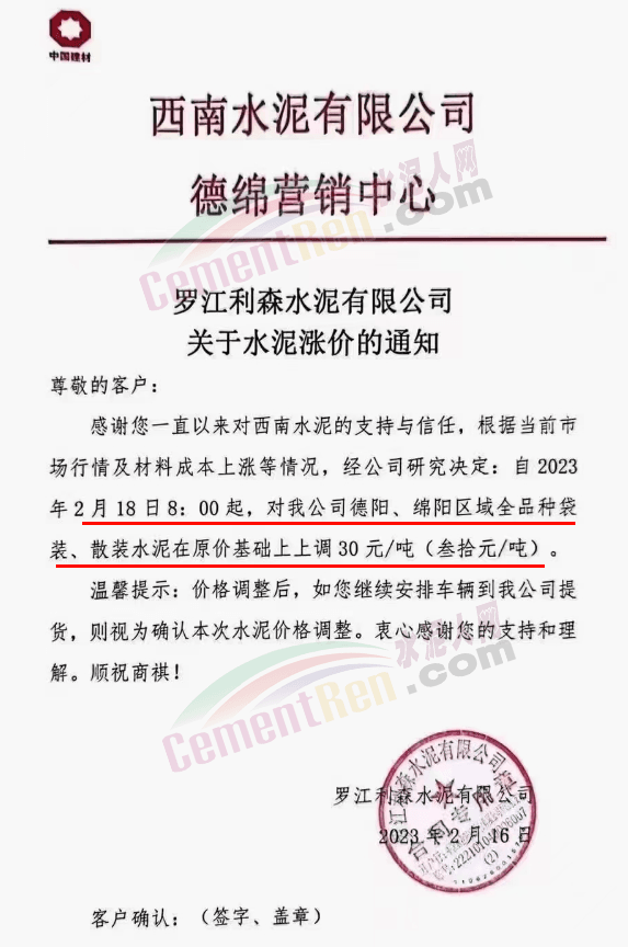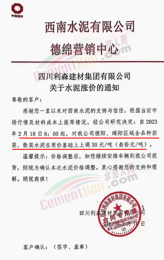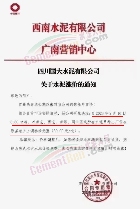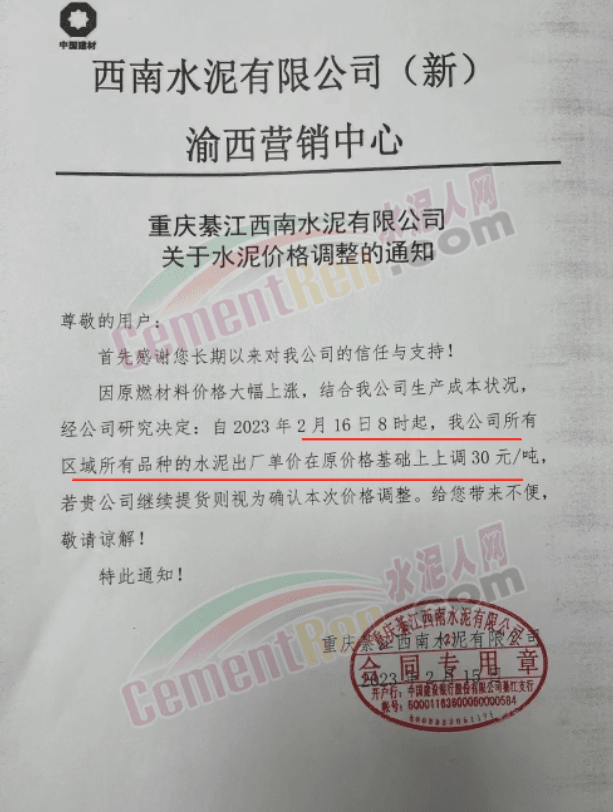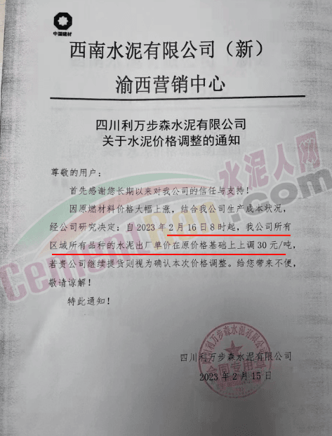 水泥人网通讯员消息,近日 ,西南地区四川、重庆、贵州多地主要品牌企业通知上调水泥价格20-30元/吨。