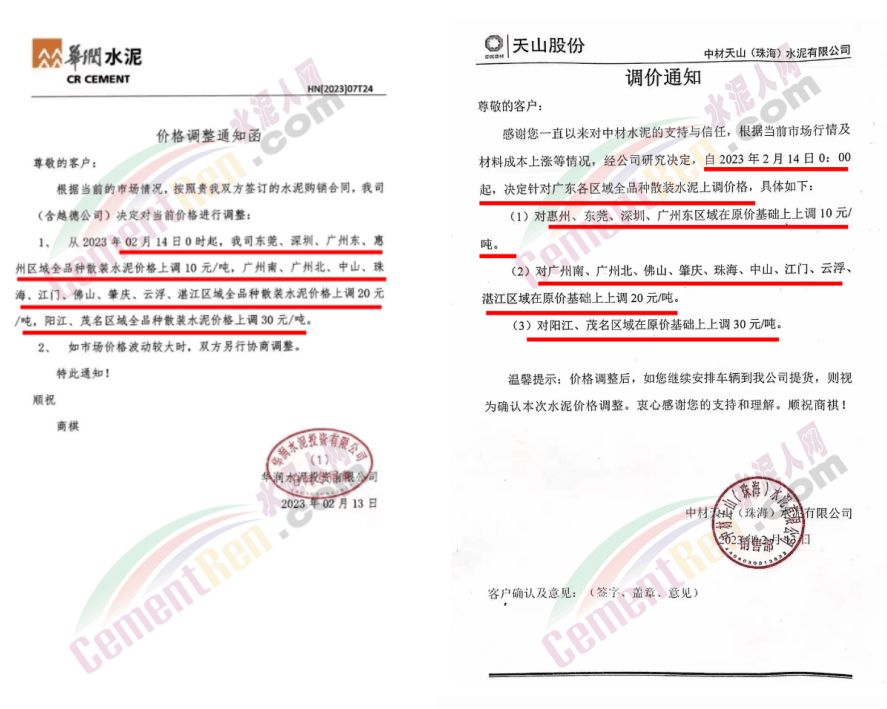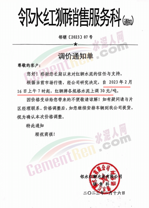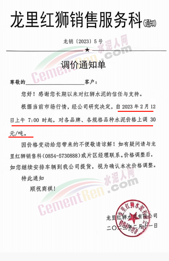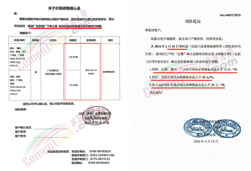 台泥(英德)公司通知针对广东省全区域熟料价格自2月9日起上调10元/吨;深圳、东莞、惠州、广州东各标号散装水泥上调10元/吨,散装水泥中转库交货同步上调。