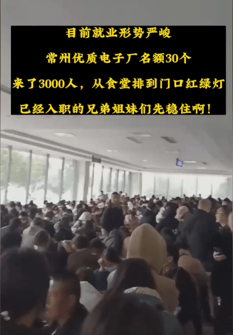 江苏常州优质电子厂,招工名额30个,来了3000人,从食堂排到门口红绿灯。
