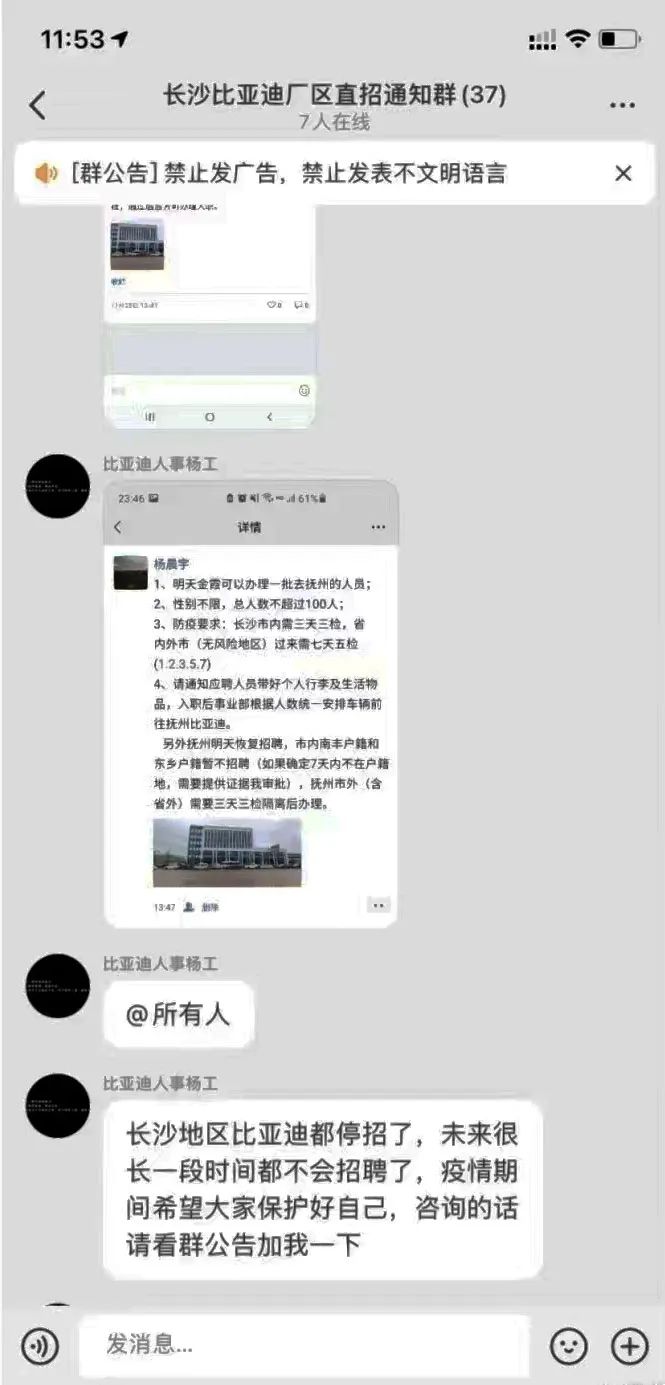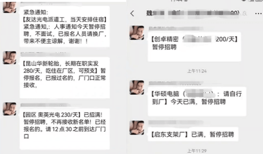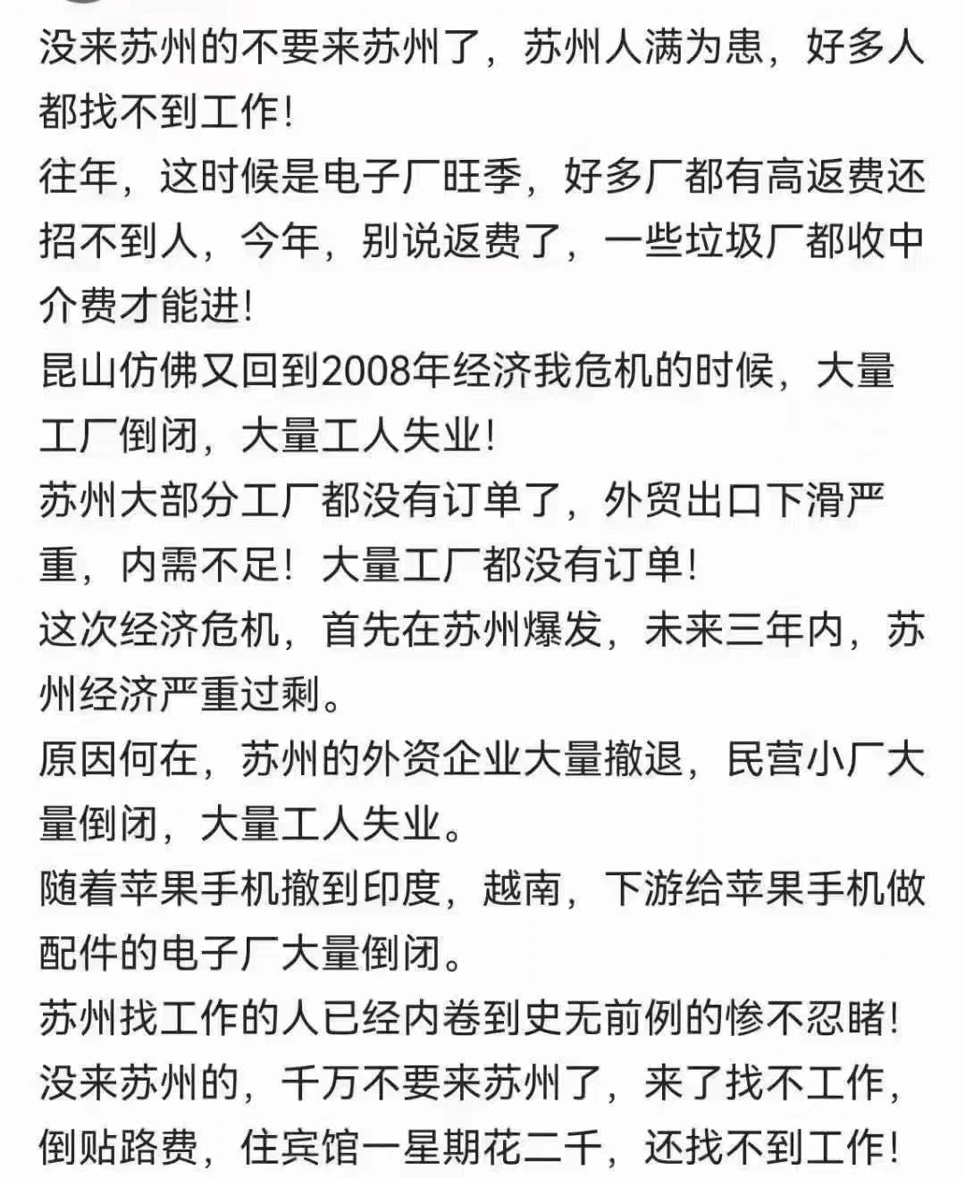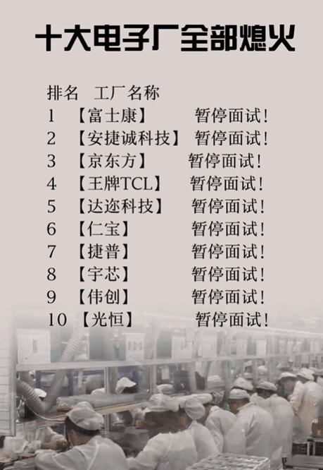 长沙比亚迪全部停招,苹果昌硕科技暂停招募代工,苏州立讯已经停招,成都5大工厂(富士康、京东方、仁宝、伟创、捷普)基本都已“熄火”,目前现在厂里都饱和了,要十几个人,都能去一百多人。