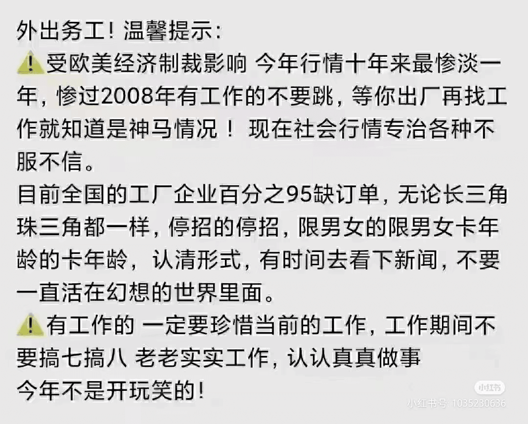 多家电子厂门口人流涌动,黑压压的人群并非做生意的,而是来找工作的,部分工厂录取比例只有10%不到,且工价也不再是人人艳羡的高价了。美利达自行车厂19块钱一小时的工价,长白班仅10个人的缺口来了300多人;新能安250个人争抢80个岗位名额;西安高新库柏面试现场,缺口几十人,现场有300多人,工友表示严重受打击,工资不高还挑人。